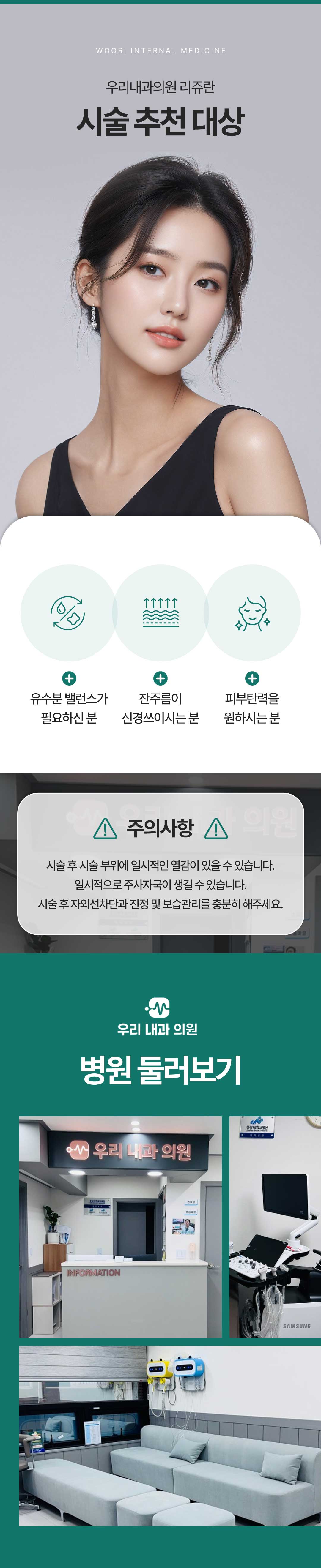 시술 후 시술 부위에 일시적인 열감이 있을 수 있습니다. 일시적으로 주사자국이 생길 수 있습니다. 시술 후 자외선차단과 진정및 보습관리를 충분히 해주세요