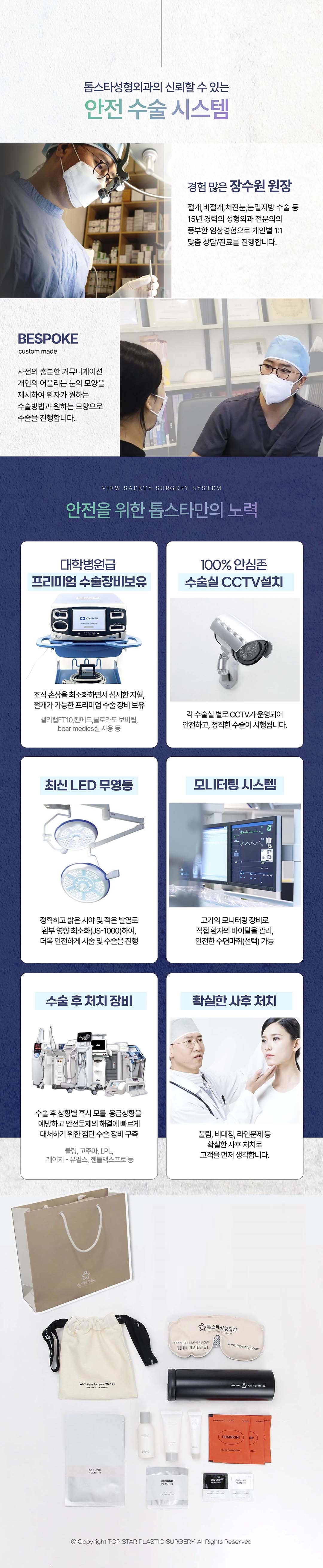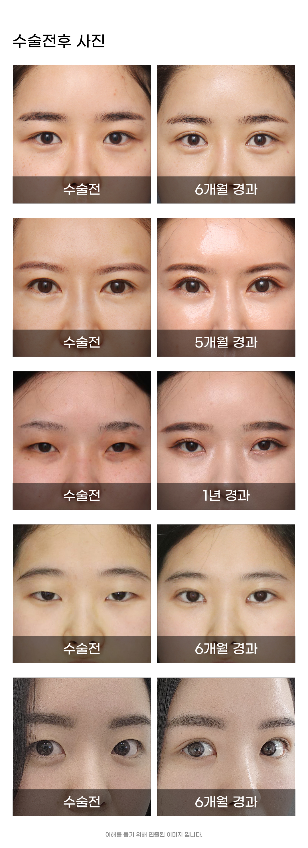 - 멍,부종,염증,출혈,흉터 - 눈물,안구건조증,눈곱 - 이물감,복시 등의 증상들은 개개인마다 차이가 있으며 드물게 오래, 지속적으로 나타날수도 있습니다. 원하는 모양을 얻기 위해서는 추가 수술이 필요할 수도 있습니다.