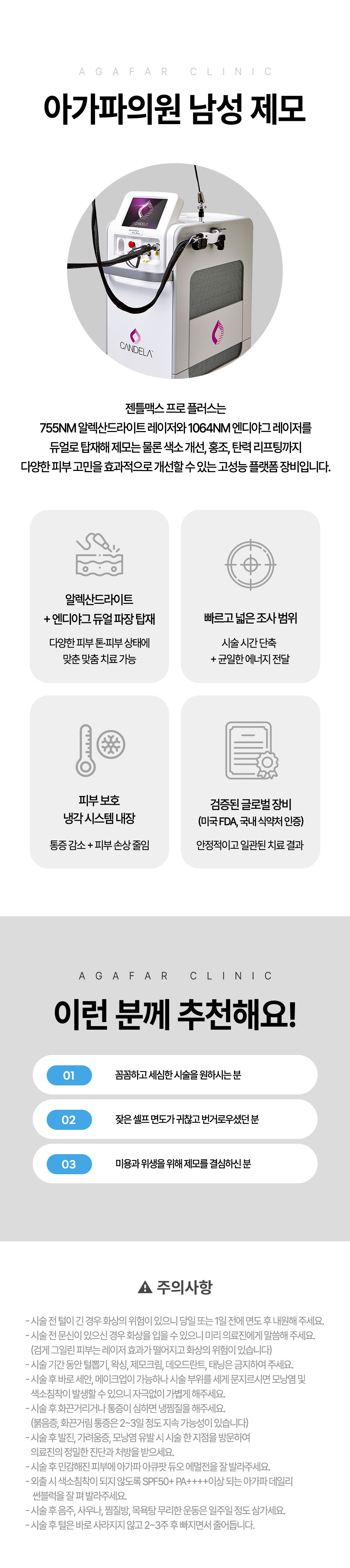 시술 전 털이 긴 경우 화상의 위험이 있으니 당일 또는 1일 전에 면도 후 내원해 주세요 시술 전 문신이 있으신 경우 화상을 입을 수 있으니 미리 의료진에게 말씀해 주세요. (검게 그일린 피부는 레이저 효과가 떨어지고 화상의 위험이 있습니다) 시술 기간 동안 털뽑기, 왁싱, 제모크림, 데오드란트, 태닝은 금지하여 주세요. 시술 후 바로 세안, 메이크업이 가능하나 시술 부위를 세게 문지르시면 모낭염 및 색소침착이 발생할 수 있으니 자극없이 가볍게 해주세요. 시술 후 화끈거리거나 통증이 심하면 냉찜질을 해주세요.