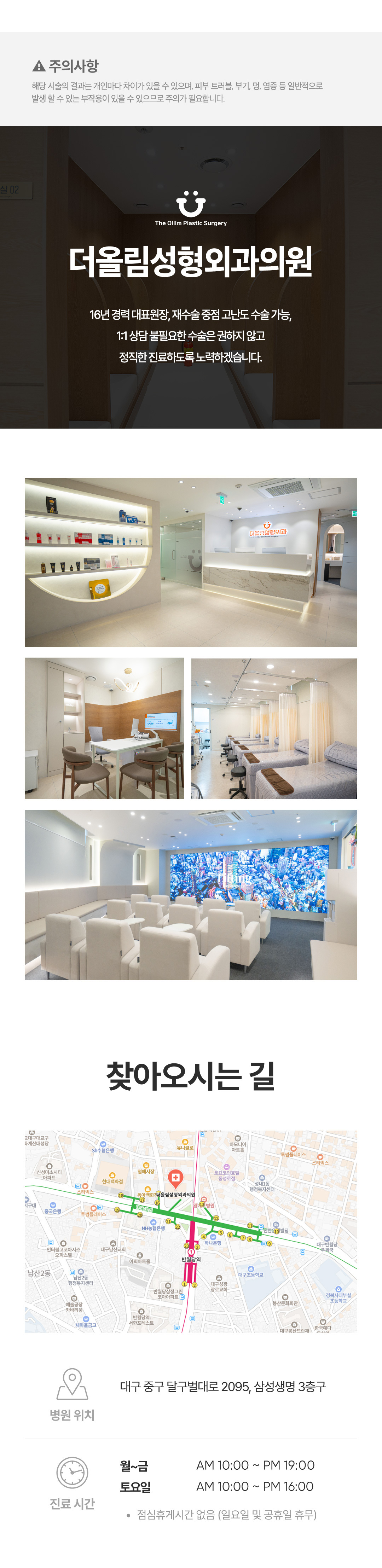 해당 시술의 결과는 개인마다 차이가 있을 수 있으며, 피부 트러블, 부기, 멍, 염증 등 일반적으로 발생 할 수 있는 부작용이 있을 수 있으므로 주의가 필요합니다.