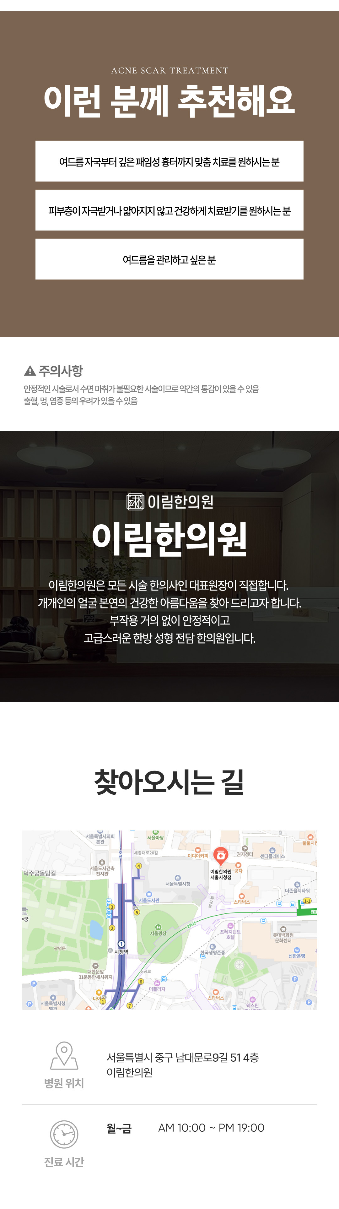 안전한 시술로서 수면 마취가 불필요한 시술이므로 약간의 통감이 있을 수 있음/ 패임성 흉터 개선을 위란 새살침 시술 시 출혈, 멍, 염증 등의 우려가 있을 수 있음
