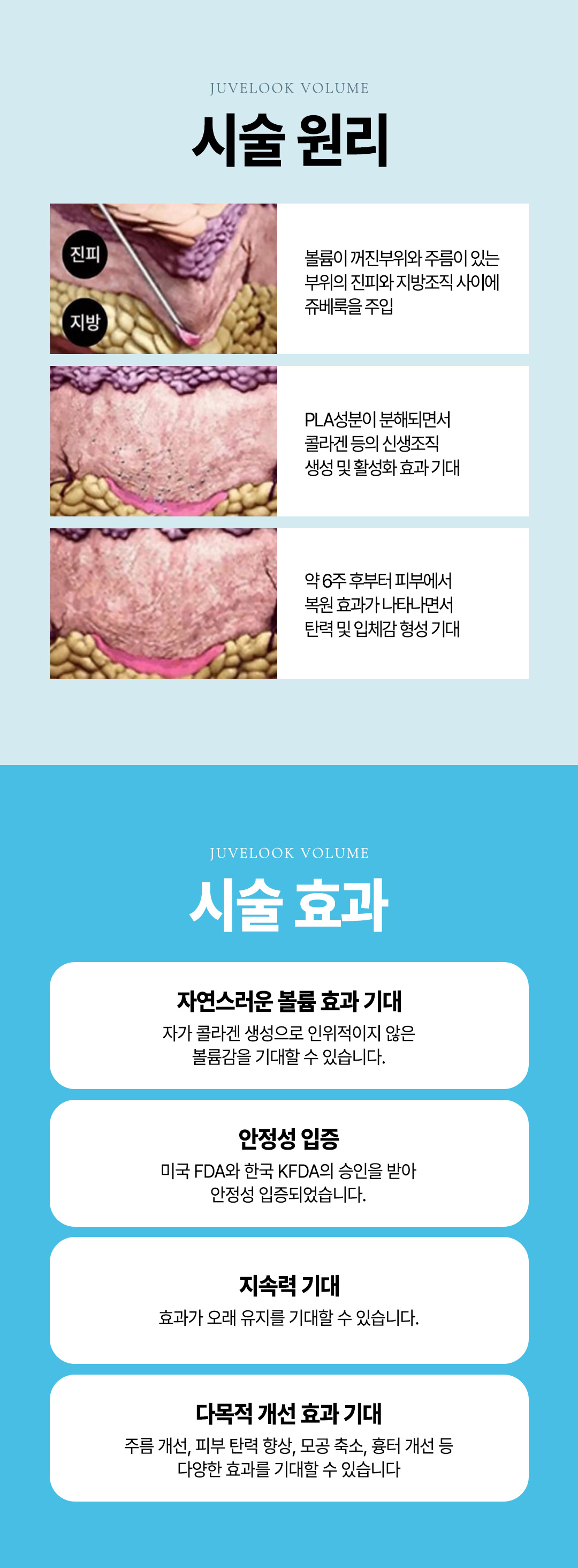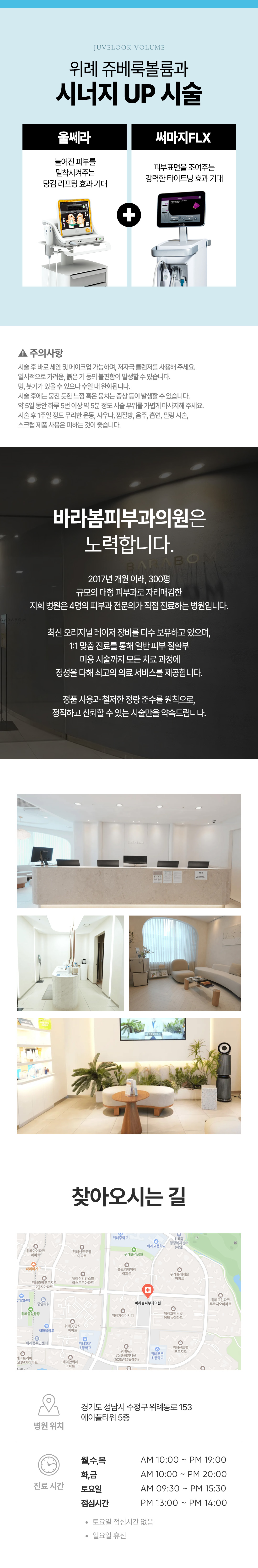 시술 후 바로 세안 및 메이크업 가능하며, 저자극 클렌저를 사용해 주세요. 일시적으로 가려움, 붉은 기 등의 불편함이 발생할 수 있습니다. 멍, 붓기가 있을 수 있으나 수일 내 완화됩니다. 시술 후에는 뭉친 듯한 느낌 혹은 뭉치는 증상 등이 발생할 수 있습니다. 5일 동안 하루 5번 이상 5분씩 시술 부위를 가볍게 마사지해 주세요. 시술 후 1주일 정도 무리한 운동, 사우나, 찜질방, 음주, 흡연, 필링 시술, 스크럽 제품 사용은 피하는 것이 좋습니다.