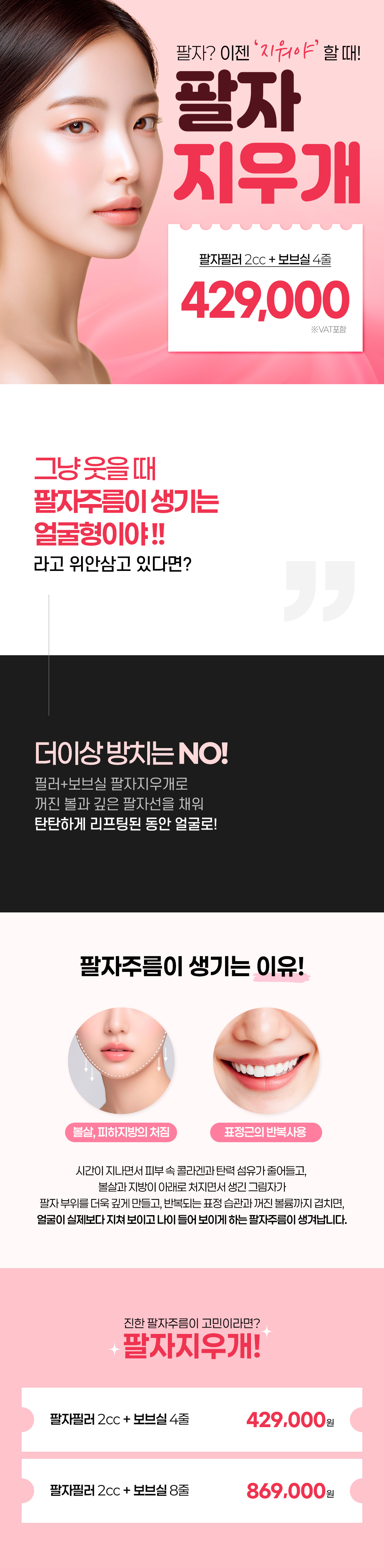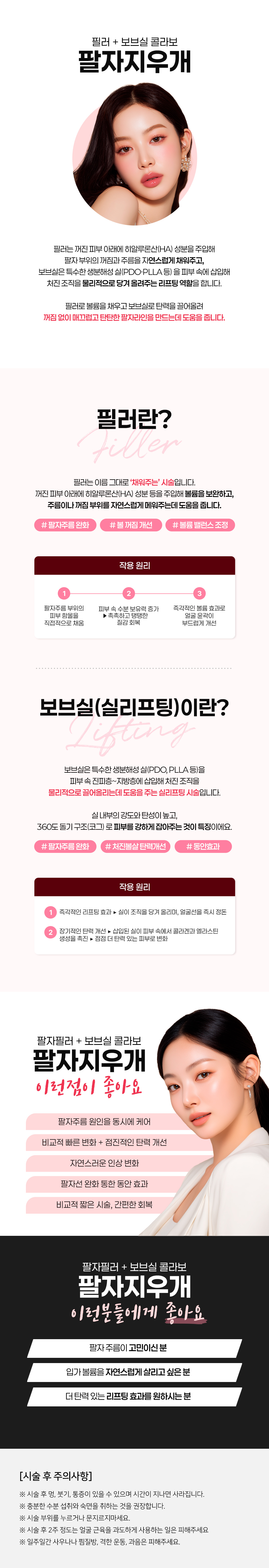 - 시술 후 멍, 붓기, 통증이 있을 수 있으며 시간이 지나면 사라집니다. - 충분한 수분 섭취와 숙면을 취하는 것을 권장합니다. - 시술 부위를 누르거나 문지르지마세요. - 시술 후 2주 정도는 얼굴 근육을 과도하게 사용하는 일은 피해주세요 - 일주일간 사우나나 찜질방, 격한 운동, 과음은 피해주세요.
