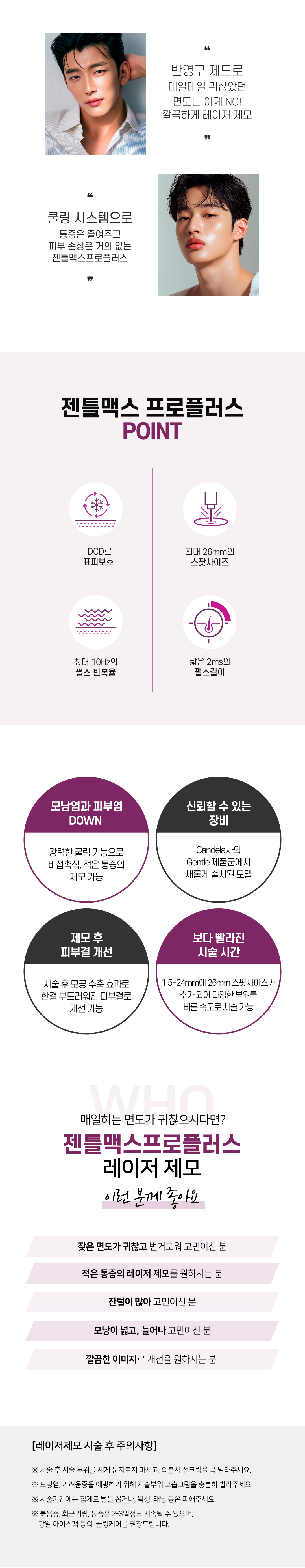 - 시술 후 시술 부위를 세게 문지르지 마시고, 외출시 선크림을 꼭 발라주세요. - 모낭염, 가려움증을 예방하기 위해 시술부위 보습크림을 충분히 발라주세요. - 시술기간에는 집게로 털을 뽑거나, 왁싱, 태닝 등은 피해주세요. - 붉음증, 화끈거림, 통증은 2-3일정도 지속될 수 있으며, 당일 아이스팩 등의 쿨링케어를 권장드립니다.