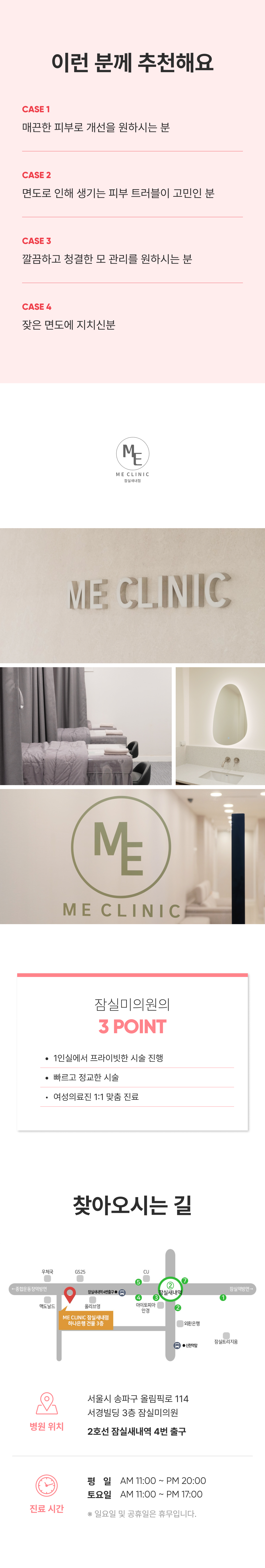 안내사항 1. 1~2일 정도 붉은 기 및 약간의 붓기가 있을 수 있으나 자연 회복됨으로 걱정하지 않으셔도 됩니다. 2. 당일 화장, 세안, 샤워 가능하나 시술 부위에 뜨거운 물이 닿는 것은 주의해 주세요. 3. 사우나, 찜질, 수영장 출입은 1주일 정도 피해주세요.